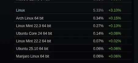 I switched to linux in december 2025, and was part of the steam survey in that month, but unfortunately they did the survey before my switch, so have yet to be part of the statistics.