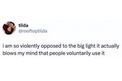 I’m violently in favor of Big Light™. Really wakes you up that flashbang when you turn it on. 🙃